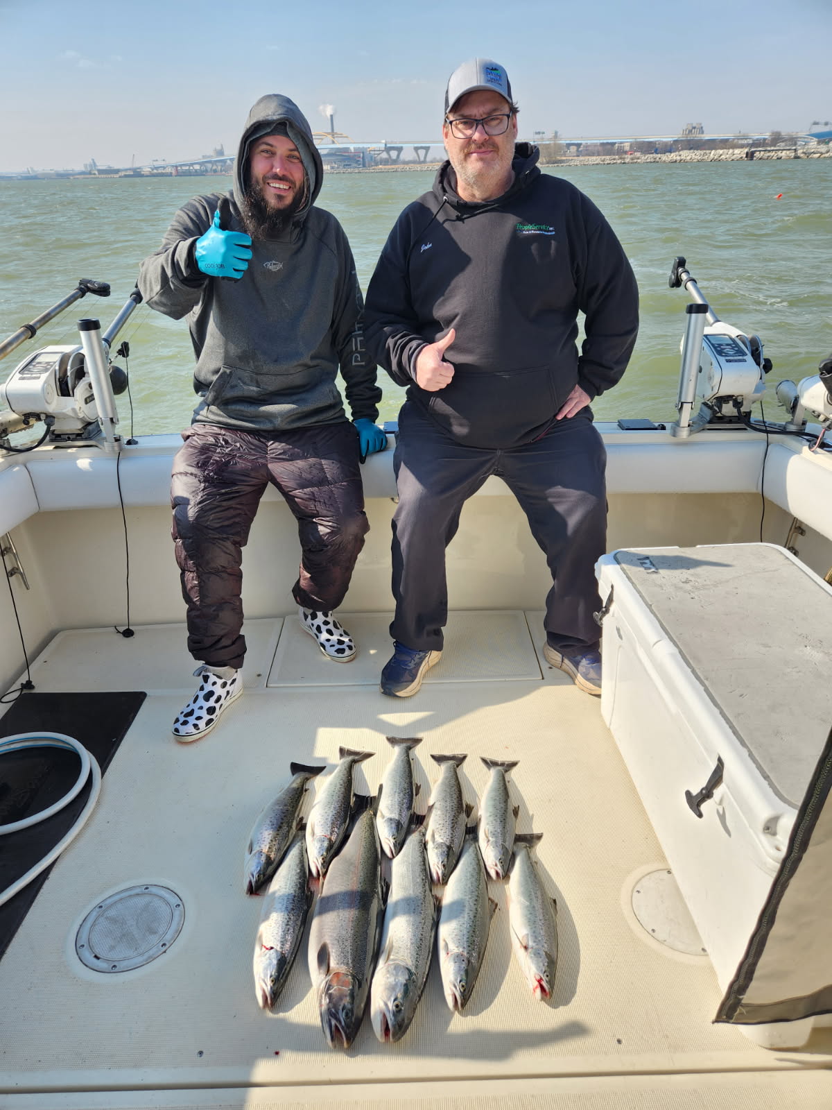 So three weeks from now we hope to be in the water and we will be catching Brown trout. The fish average 2 to 15 pounds and real good fish will be over 20 pounds. We have boated two over 30 pounds. The weather can be cold, so our cockpit is completely enclosed during this time of year to keep you comfortable during the trip. Fishing the harbor usually allows us to get a trip in even if it is windy. We run all spoons this time of year. The board rods are one, tow and three color lead core. We use mono dipsy rods and the downriggers are light mono lines. We expect a good Brown trout bite this spring.