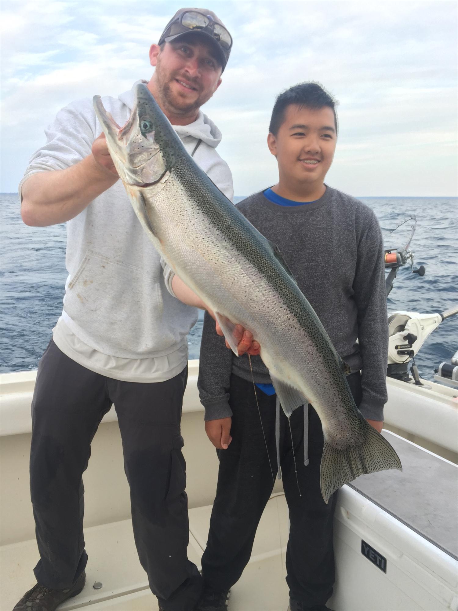 So are catch rate per year depends on stocking and reproduction but Steelhead, the name for and ocean run Rainbow trout, are also a product of where we fish. If we are not fishing deeper waters further from shore our catch rate will go down. We do catch Steelhead close to shore and there is a potential to catch them on any trip the odds go up the deeper water we fish. Steelhead are caught closer to the surface and sometimes just a few feet below but they tend to school up in deeper water, especially in the summer months. Many times if the water temperatures are not too warm near the surface they will feed on bugs that fall in the water. If a season sets up for an offshore bite we will tend to catch more Steelhead during the season. Offshore is 8 to 15 miles from shore and over at least 150 feet of water. We have had seasons set up where you can hook up on 30 plus Steelhead in a trip. But when a Steelhead school decides it is time to move they are gone fast.